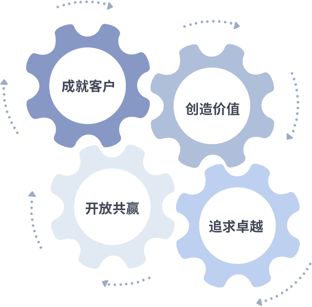 成就客户是一切决策的出发点,,,创造价值是衡量所有工作的标准,,追求卓越是我们做事做人的态度,,,,开放共赢是我们的格局也是最终的结果。。。。价值观的齿轮环环相扣,,,,推动着组织里的每个人不断向前。。。
